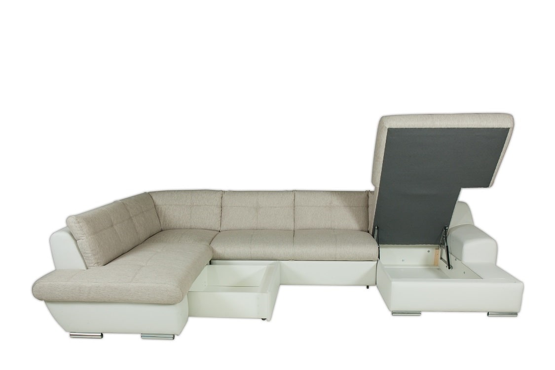Диван со встроенным механизмом «дельфин» подойдет для квартир-студий или гостевой комнаты. Под оттоманкой и кресельной секцией находятся бельевые ящики. Удобная спинка и комфортные сидения делают этот диван отличным местом для просмотра вечернего кино, а после кроватный механизм позволит быстро и просто разобрать спальное место.