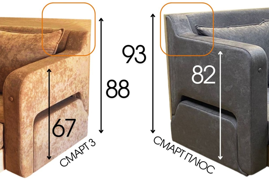 Не отличимые с первого взгляда, внешние отличия диванов заключены в размерах и деталях дизайна. На фото Фото контент хорошо видны главные отличия. Это высота дивана и подлокотников и такая деталь как дизайн спинки. В модели Смарт 3 мы видим край стола, выполняющий важный элемент дизайна а в диване Смарт Плюс он скрыт.
