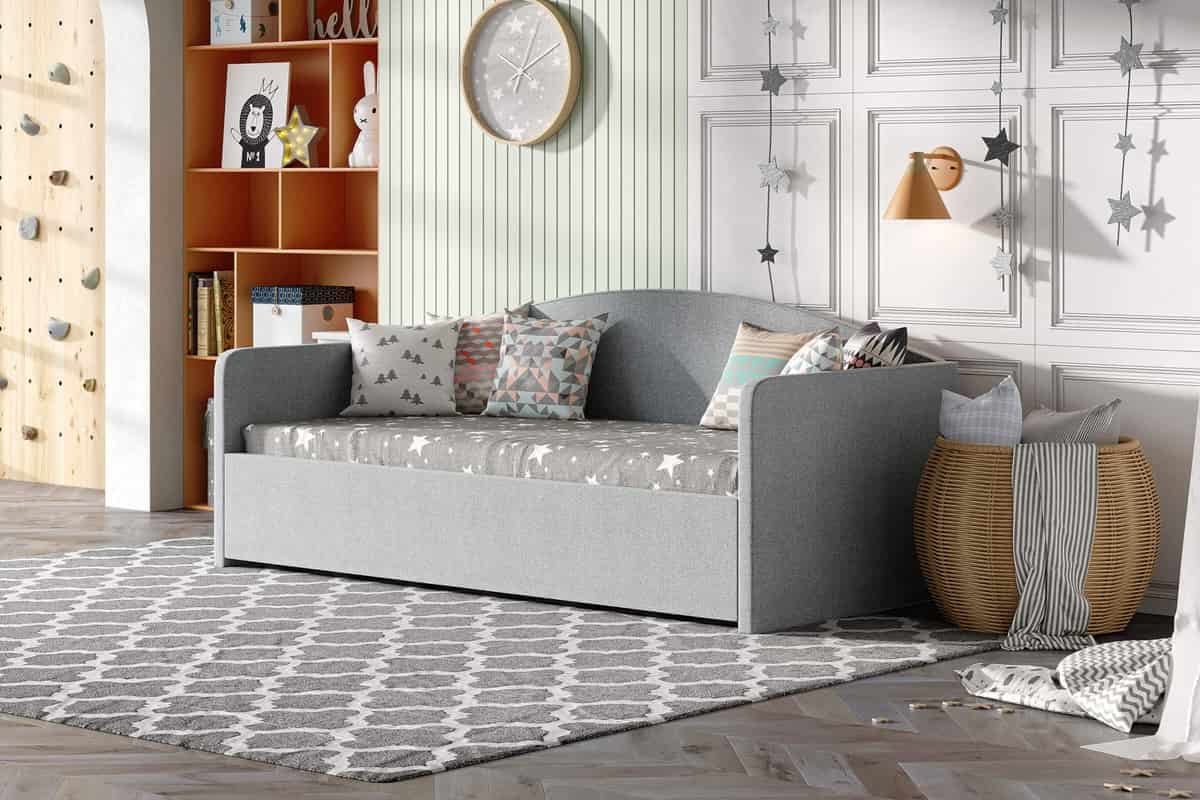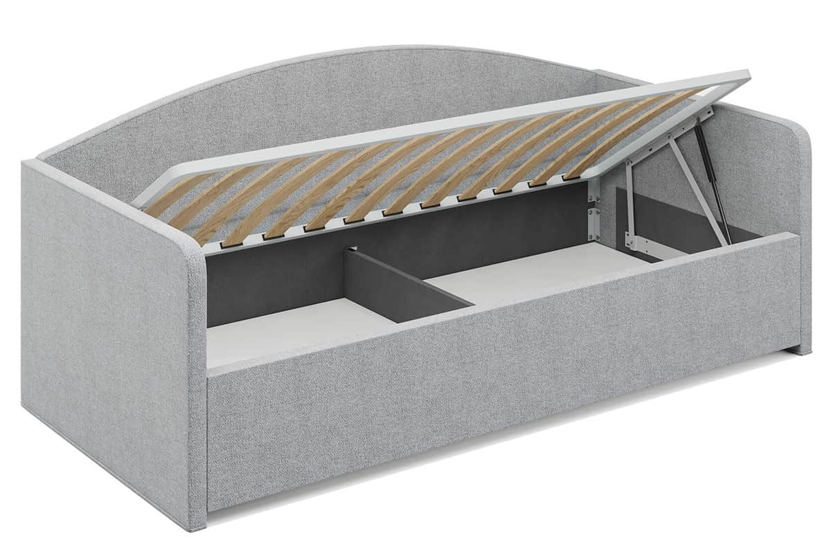 Подъёмный механизм легко открывается и предоставляет свободный доступ к бельевому ящику, в который можно сложить постельные принадлежности, игрушки, книги или сезонные вещи. Благодаря этому детская всегда будет выглядеть аккуратно, а пространство для игр и занятий больше.