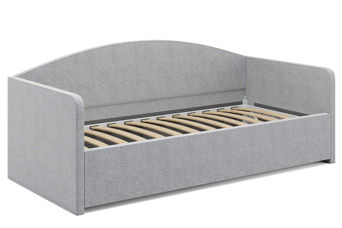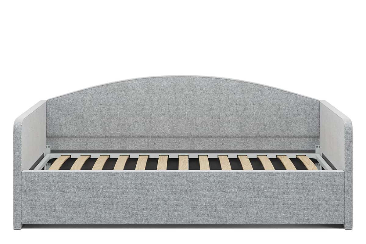 Каркас кровати обитый выбранной тканью, металлическое основание с берёзовыми ламелями