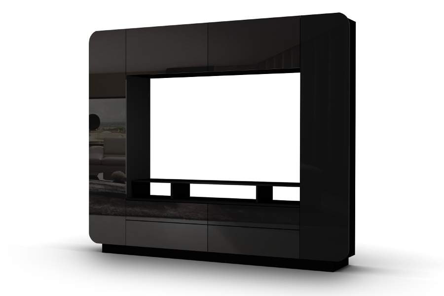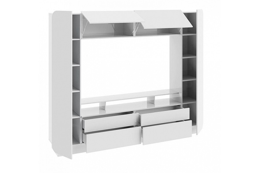 Дизайн стенки-гостиной Купертино выполнен в современном техно стиле. За закрытыми дверцами расположились: 2 секции, 10 полок, 4 удобных и вместительных выкатных ящика.